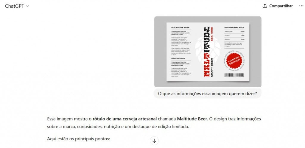 Se o usuário estiver com alguma dúvida em relação a uma imagem, como o que está escrito em uma determinada embalagem de um produto, a inteligência artificial também pode ajudar. Basta enviar a foto do item e solicitar a análise em um prompt simples.