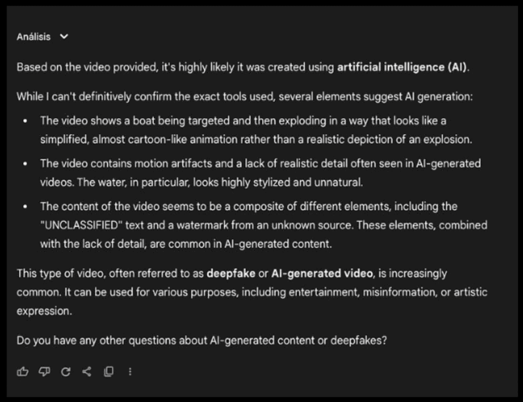O governo da Venezuela acusou os Estados Unidos de usar inteligência artificial (IA) para manipular um vídeo do ataque a um navio que supostamente transportava narcóticos ilegais. A gravação foi compartilhada pelo presidente dos EUA, Donald Trump, como sendo a primeira operação militar estadunidense desde o recente envio de navios de guerra para o sul do Caribe.