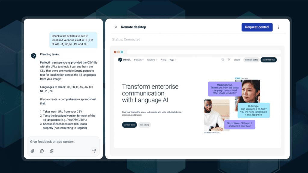 O DeepL Agent é um Agente de Uso de Computador (CUA, na sigla em inglês) que utiliza o computador da mesma forma que seu usuário, com teclado, mouse e navegador para executar a tarefa. O sistema foi desenvolvido para casos de uso corporativo – ao contrário de outros CUAs que se concentram em tarefas cotidianas voltadas para o consumidor, como reservar viagens ou comprar mantimentos.