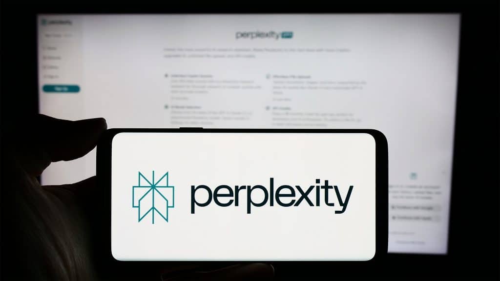 Pessoa segurando celular com logotipo do Perplexity e o buscador aberto num computador ao fundo